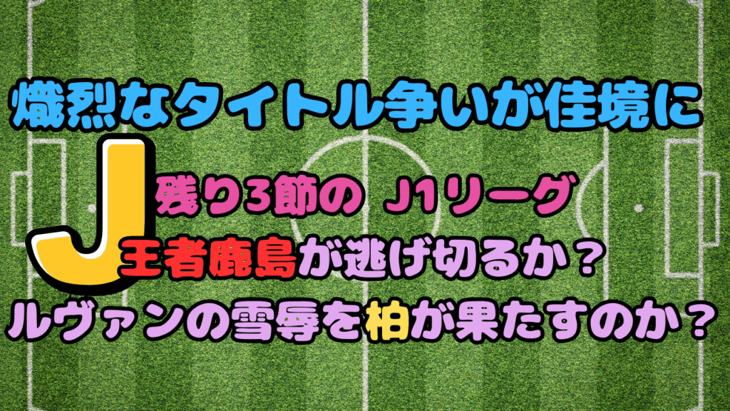J1リーグはついに残り3節。いよいよ優勝争いが最終局面を迎えています。 首位を走るのは鹿島アントラーズ(勝ち点67)、そして1ポイント差で追うのが柏レイソル(勝ち点... -