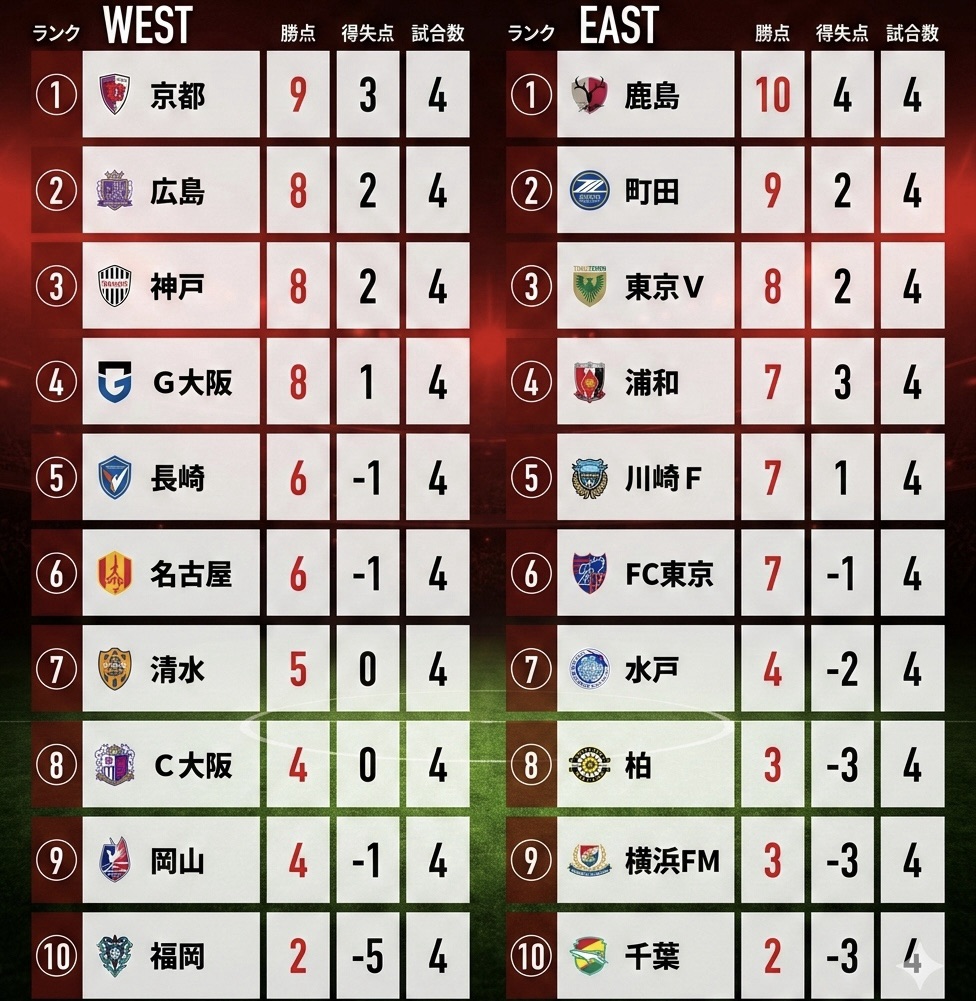第4節は、柏レイソルが長いトンネルを抜け出し、鹿島アントラーズが驚異的な勝負強さを見せつけるなど、各チームの「執念」が結果に結びついたエモーショナルな週となりました。 WESTでも京都が広島に競り勝つなど、リーグ戦はますます混戦模様の予感が漂っています。